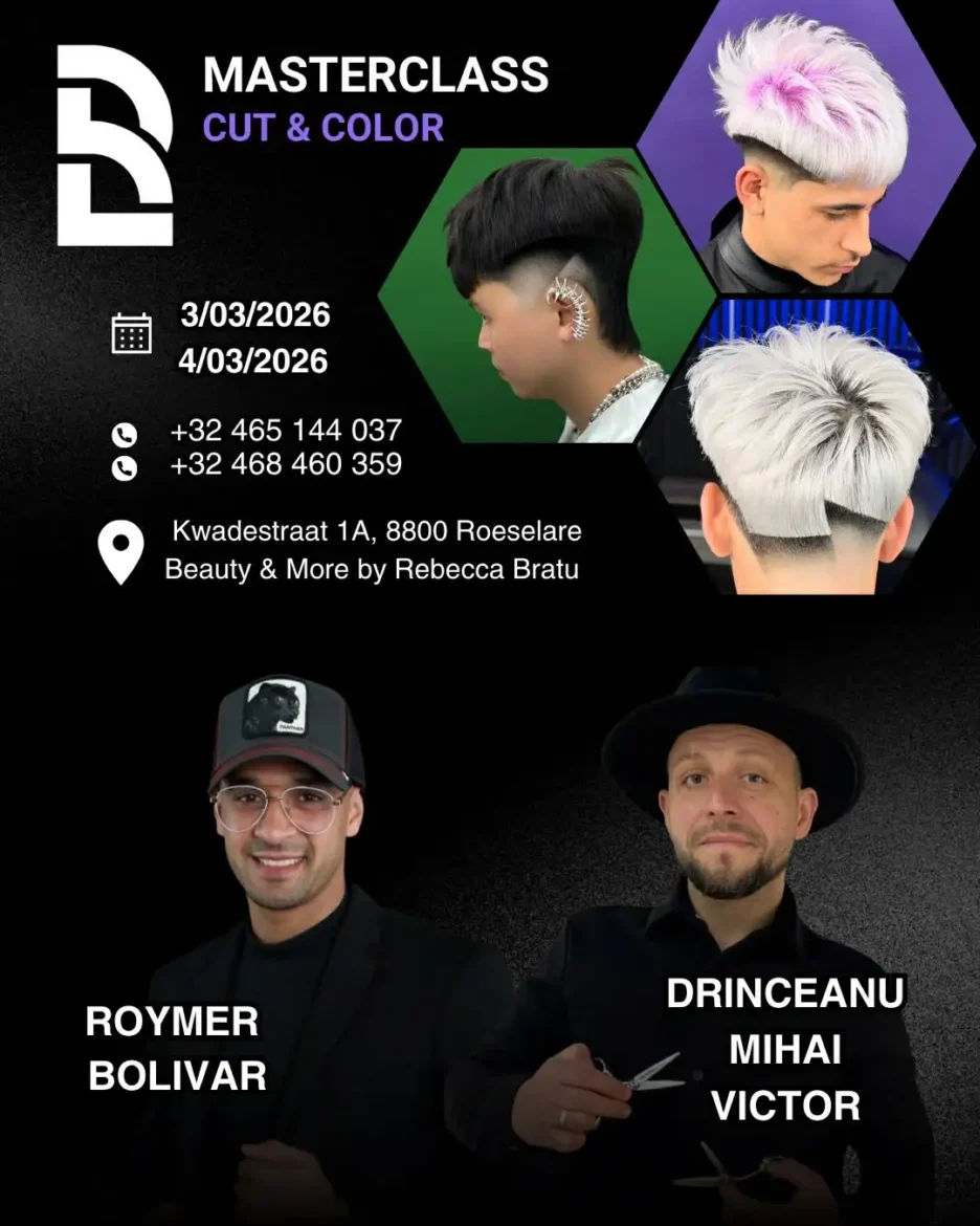 Pe 3 și 4 martie 2026, la Beauty & More by Rebecca Bratu, în Roeselare, are loc Masterclass CUT & COLOR, un seminar intensiv de Look & Learn + Workshop, susținut de doi profesioniști recunoscuți în domeniu: